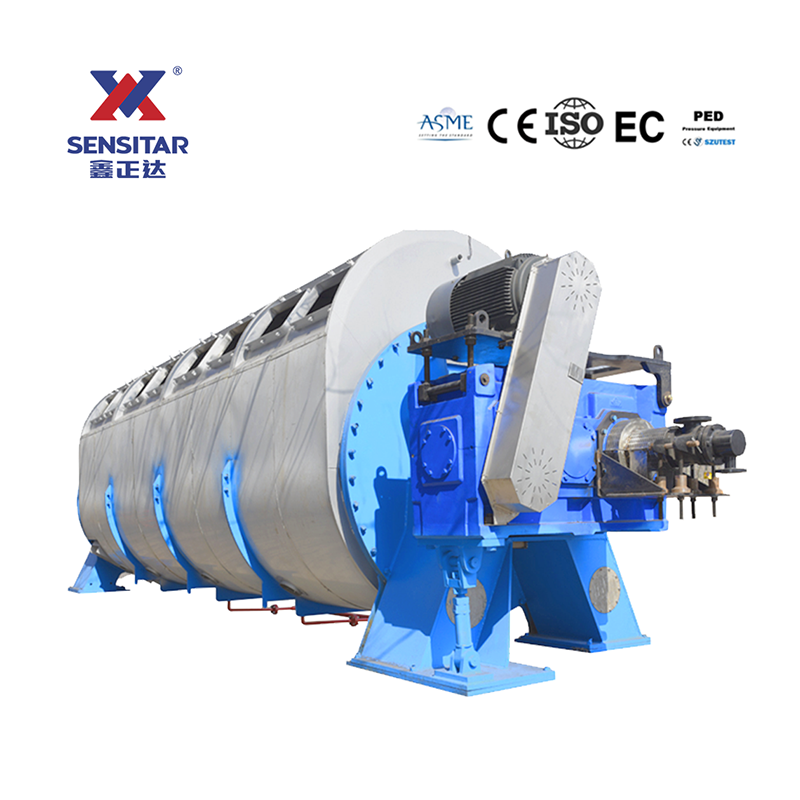 Влажный материал подается в сушилку через вход на приводном конце. Материал транспортируется через сушилку и перемешивается с помощью лопаток, установленных на роторе.